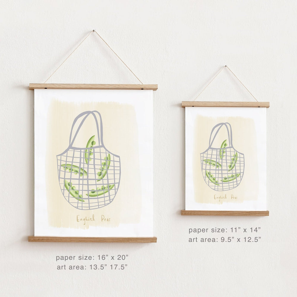 Sweet peas in their pods, bundled in a hand-drawn market tote—this playful watercolor print adds a fresh, garden-inspired touch to any room. A lovely pick for nurseries, dining nooks, or anywhere you’d like a little hint of green. Display it solo or pair it with the full Market Bag trio for a cheerful veggie-themed wall.